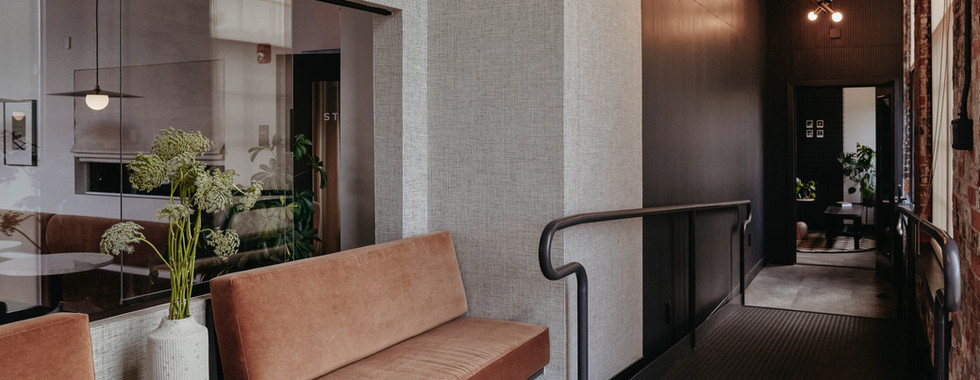 The original Steer suite was to remain home base, our job was to help Slate become the fancy little sister next door. The two spaces, while different, remained connected by a decorative “secret door” composed of metal and glass. When closed, the door stands tall as a design feature, providing privacy as required. When open, guests and colleagues can easily flow through each space.